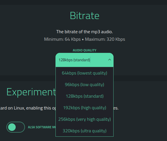 Essa opção nos permite configurar a qualidade do áudio que desejamos entregar aos usuários, variando de 64kbps (qualidade baixa) à 320kbps (qualidade alta):