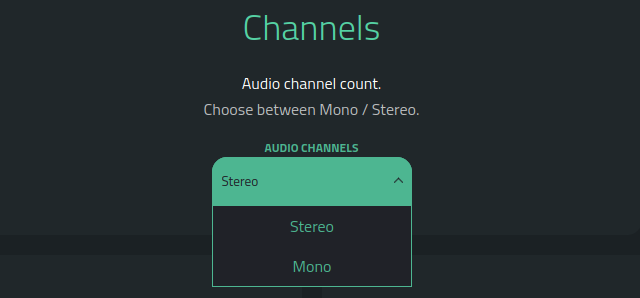 Em channels, podemos escolher a quantidade de canais (1 ou 2), ou seja, mono ou stereo: