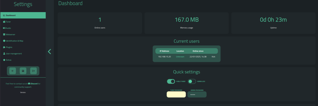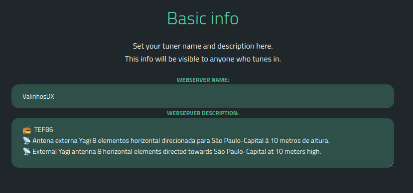 A opção public tuner determina quais usuários podem acessar o seu Fmdx Webserver. Ela vem ativada por padrão, portanto, todos os usuários poderão escutar e operar seu rádio.