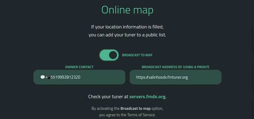 Além disso, no painel Online map, podemos registrar nosso servidor no serviço de mapa do fmdx.org: