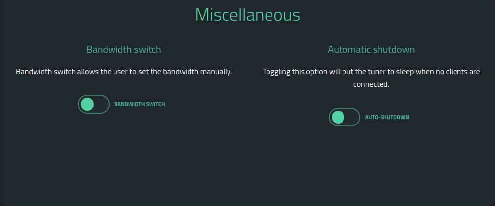 Por fim, esta seção permite que ajustemos mais duas funcionalidades diferentes: permissão ao usuário para alterar a largura de banda e autodesligamento do tuner (quando estiver sem usuários).