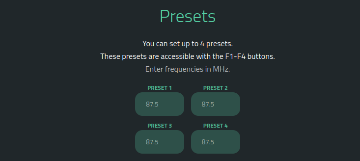 Presets permite que pré-configuremos quatro frequências que podem ser acessadas através das teclas F1 à F4. Funciona como um atalho para estações preferidas.