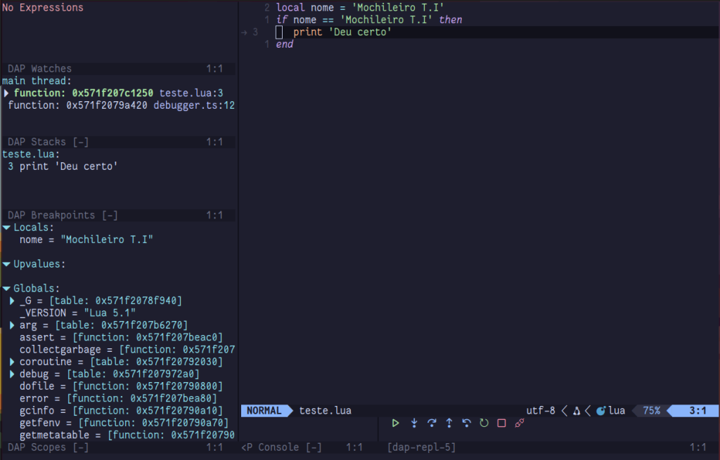 Agora sim a função de debug no Neovim está completa! Existem outros plugins que podem melhorar ainda mais a experiência de depuração no editor.