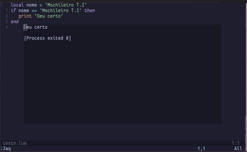 }Como sempre, salve, saia e entre novamente no Neovim, mas desta vez, abra o arquivo Lua de teste anteriormente criado.