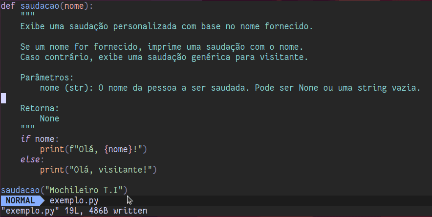 De forma semelhante, ao pressionar a tecla g e em seguida, a tecla d (abreviação de go to definition) com o cursor ainda sobre a chamada da função saudação(), você irá diretamente para ela: