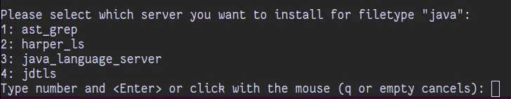 Por exemplo, vamos supor que queremos saber o nome dos servidores de linguagem Java. Digite :e temp.java. Em seguida, digite :Lspinstall e veja o resultado: