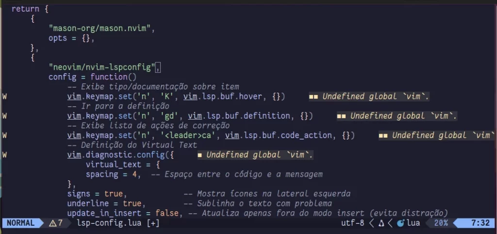 Como exemplo, vamos retornar ao arquivo lsp-config.lua. Note que o lua_ls faz alguns alertas sobre o objeto vim quando retornamos ao modo normal do editor: